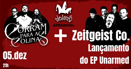 Dia 05 de dezembro de 2019 duas excelentes bandas brasileiras se apresentam no Jokers em Curitiba/PR. Corram Para as Colinas e Zeitgeist Co. levam suas obras para cima dos palcos e prometem muita energia, peso, técnica e qualidade em suas apresentações.
