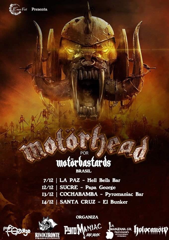 A banda passará por La Paz – no sábado, 07/12/2019 –, além de Sucre, Cochabamba e Santa Cruz Se La Sierra no fim de semana seguinte, levando pela primeira vez o “Motörhead Day” para terras internacionais. Para mais informações sobre os eventos no Facebook: Rinoceronte Producciones Holocausto Producciones
