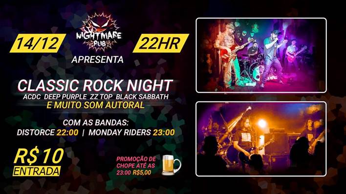 A mescla perfeita entre o Rock and Roll e o Hard Rock será o tema principais do evento que será realizado dia 14 de dezembro de 2019 em Goiânia. Isso porque as bandas Monday Riders e Distorce unem suas forças e promovem seus shows para quem comparecer no Nightmare Pub.