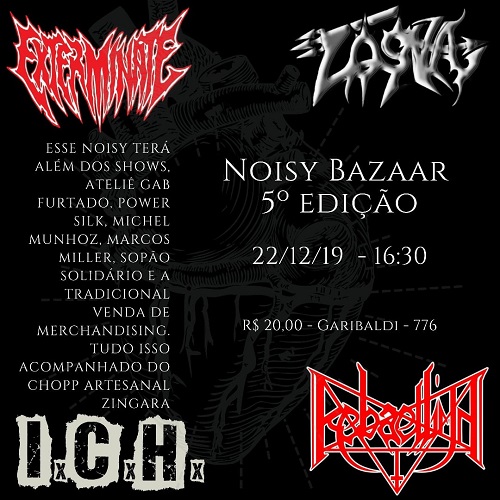 Nesta edição o festival alterou sua configuração, adicionando mais uma banda ao ‘cast’, fechando assim quatro atrações de diversos estilos. A Rebaelliun, na ativa há mais de duas décadas, segue divulgando seu último EP, “Bringer of War (The Last Stand)” (2017), o último registro com o guitarrista Fabiano Penna, falecido no ano passado, e também o single “The Messiah”, já com o novo guitarrista, Evandro Passos. Ainda no campo do Death Metal, a Exterminate divulga o álbum “Pray For a Lie”, lançado em 2018 e considerado um dos melhores lançamentos do ano. Representando o Thrash Metal, o ‘power trio’ Losna, atualmente em estúdio, tocará músicas que englobam sua carreira de 22 anos de estrada e três discos na bagagem. O Hardcore do I.C.H., da prolífica cidade de Canoas, foi fundado em 1993, em meio a uma forte leva de bandas, influenciados principalmente pelo Punk e Hardcore oitentista, com letras compostas na língua portuguesa e uma sonoridade básica, crua e direta. Com quatro discos e um EP lançados, a banda foi uma das fundadoras do Coletivo BIL (Bandas Independentes Locais) e segue na ativa compondo, produzindo e atuando na cena Underground.