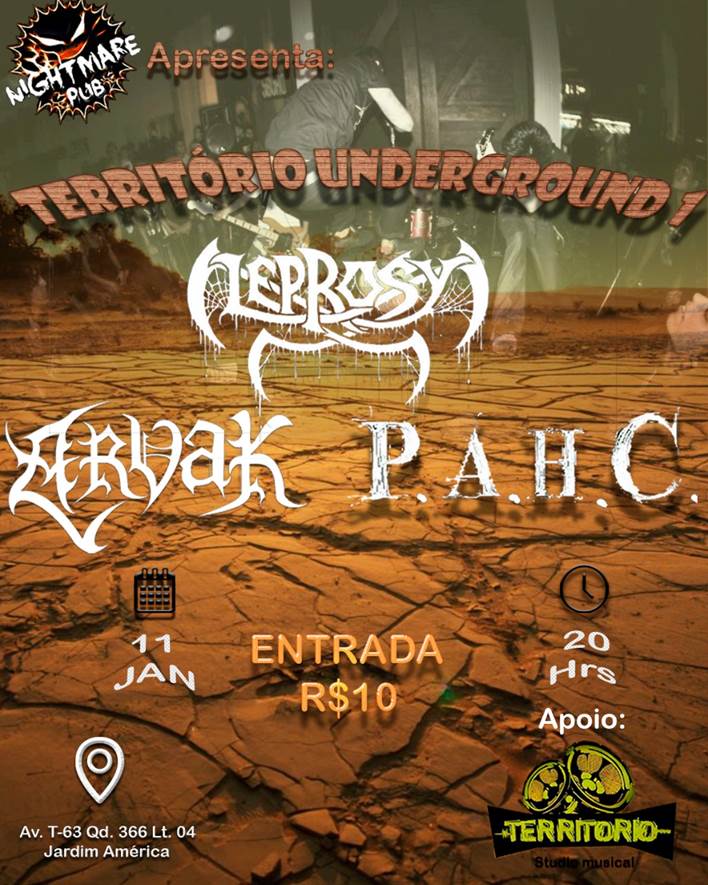 Além do Leprosy, as bandas Arvak e P.A.H.C. estão confirmadas como atrações do evento, que terá início às 20h00 e com ingressos sendo vendidos por apenas R$ 10,00.