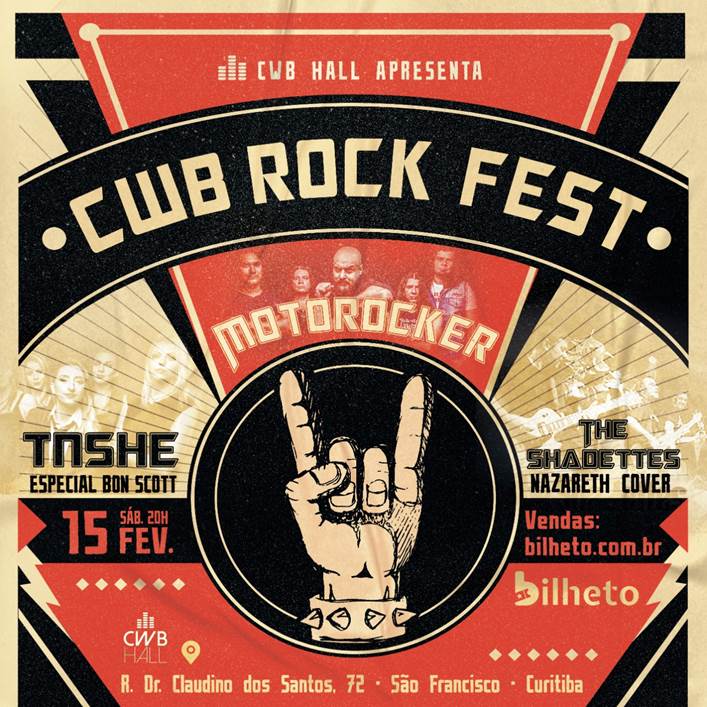 Será realizado, em Curitiba/PR, o megaevento “CWB Rock Fest”, onde grandes nomes da cidade se apresentam. O nome do Motorocker é a atração principal do evento e confirma essa como a primeira apresentação do ano em sua cidade natal. O time de peso, formado por músicos conceituados do cenário brasileiro, prepara aquele show vibrante e contagiante, que só eles sabem fazer.