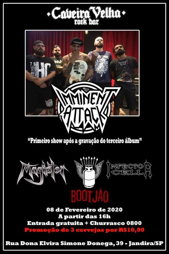 Dia 08 de fevereiro de 2020 será realizada uma verdadeira festa envolvendo quatro grandes nomes do Metal agressivo e extremo do Brasil. As bandas Infector Cell, Imminent Attack, Magister e Bootjao se apresentam juntas no Caveira Velha Rock Bar.