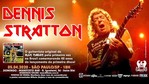 Considerado um dos marcos fundamentais da New Wave of British Heavy Metal, o álbum de estreia do Iron Maiden, “Iron Maiden” (1980), será celebrado pelo guitarrista Dennis Stratton, que se apresentará pela primeira vez no Brasil. O show em São Paulo ocorre no dia 05 de abril de 2020 (domingo), a partir das 18h00, no Manifesto Bar. O músico inglês será acompanhado por uma banda com experientes músicos brasileiros durante todas as datas da turnê.