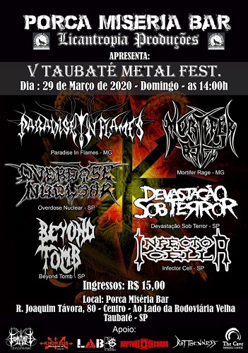 No dia 29/03/2020, domingo, a cidade de Taubaté/SP receberá o show de divulgação do ‘debut’ do Overdose Nuclear, que fará parte do festival “V Taubaté Metal Fest”, ao lado das bandas Paradise in Flames, Mortifer Rage, Beyond Tomb, Devastação Sob Terror e Infector Cell. O festival será realizado no Porca Miséria Bar, localizado na Rua Joaquim Távora, 80, centro de Taubaté, com horário marcado para as 14h00 e ingressos custando R$ 15,00.