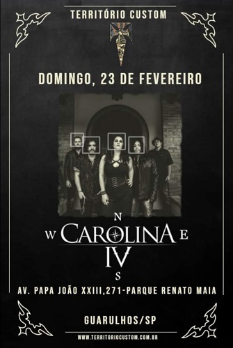 A banda de Symphonic Metal Carolina IV fará show no próximo domingo, 23/02/2020, na cidade de Guarulhos/SP, dividindo o palco com as bandas Degraus, Expiões e Rocinante. O show será realizado dentro do “Domingo Rock”, no Território Rock Burguer (Avenida Papa João XXIII, 271), a partir das 16h00.