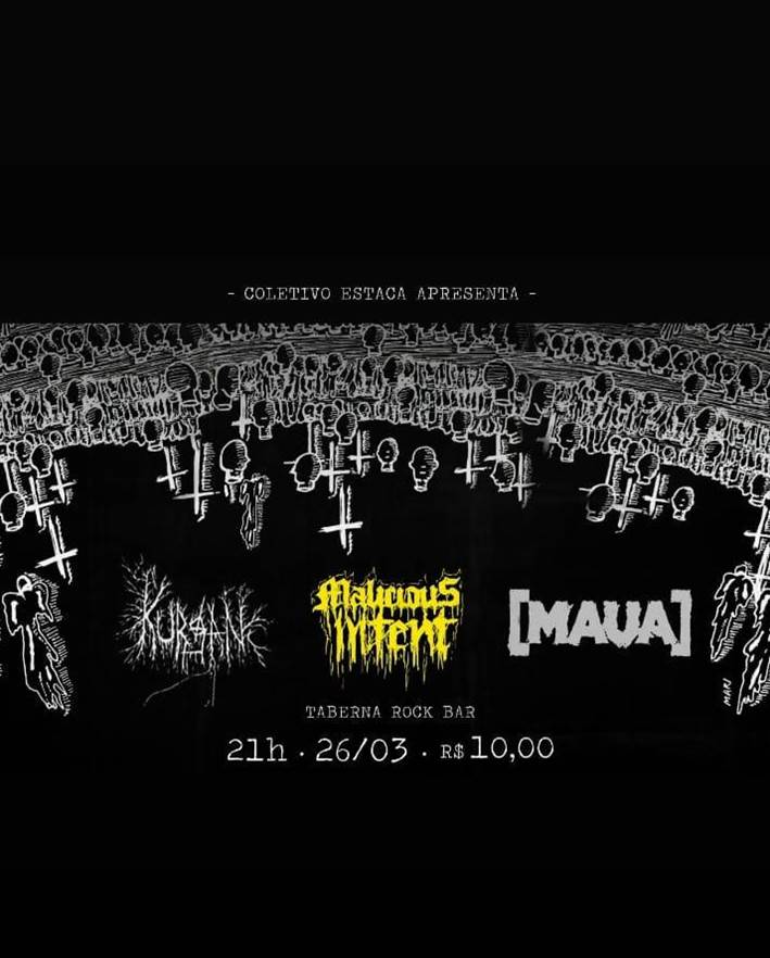 Três nomes relevantes do Metal Extremo brasileiro, as bandas Maua, Crustcore e Malicious Intent, se apresentam dia 26 de março de 2020 no Taberna Rock Bar, em Aracaju/SE.