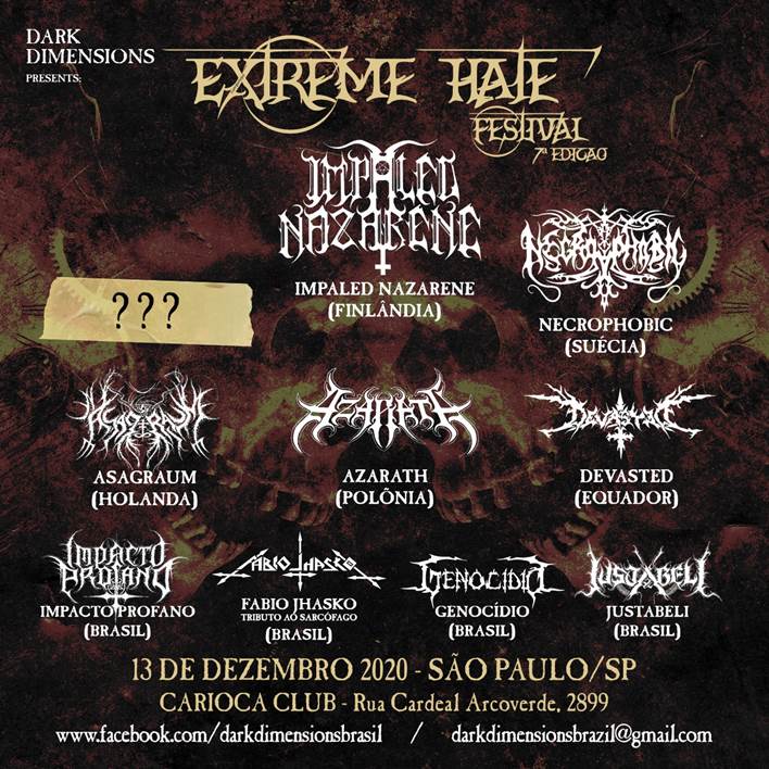 Consolidando-se no Brasil como um dos maiores e melhores festivais de Metal extremo do país, os organizadores do “Extreme Hate Festival” acabam de anunciar o ‘cast’ da sétima edição, que será realizado em São Paulo, no Carioca Club, dia 13 de dezembro de 2020.