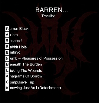 “Barren...”, terceiro álbum cheio do quarteto, já está gravado e encontra-se em fase de mixagem no Casanegra Studio em São Paulo/SP sob produção de Rafael Augusto Lopes (Zumbis do Espaço, Living Metal), e vai reunir 11 faixas inéditas: “Barren Black”, “Axiom”, “Respect!”, “Rabbit Hole”, “Embryo”, “Numb – Pleasures of Possession”, “Beneath The Burden”, “Licking The Wounds”, “Anagrams Of Sorrow”, “Compulsive Trip” e “Knowing Just As I (Detachment)”.