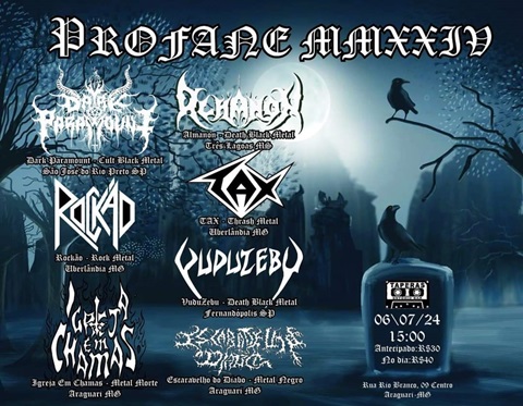 O quarteto foi confirmado para se apresentar no festival “Profane MMXXIV”, que ocorrerá no dia 06/07/2024, a partir das 15h00, na cidade de Araguari/MG. O evento promete ser um grande encontro de hordas nacionais e contará com a participação de Dark Paramount, Rockão, Tax, Igreja Em Chamas, VuduZebu e Escaravelho do Diabo.