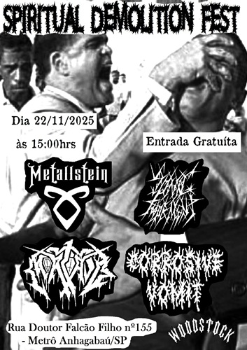 A banda santista de Death/Thrash Metal Metallstein é uma das atrações confirmadas para o “Spiritual Demolition Fest”. O evento, com entrada gratuita, será realizado no dia 22 de novembro de 2025, em frente à lendária loja Woodstock Rock Store, em São Paulo/SP. O festival contará também com as bandas Corrosive Vomit, Mortório e Sonic Torment, prometendo uma tarde de puro Metal Extremo.