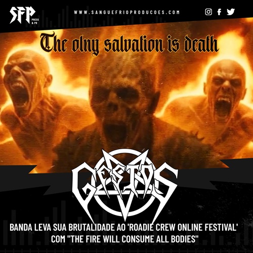 Na última sexta-feira, 10 de outubro, o ‘lyric video’ de “The Fire Will Consume All Bodies”, da banda de Death Metal Gestos, conquistou notável projeção nacional. A produção foi apresentada na 67ª edição do “Roadie Crew - Online Festival”, um dos mais relevantes eventos digitais da América Latina, integrando uma seleção de artistas ao lado de nomes expressivos como Profane Art, Sex Trash, Darkship e Loss. O material completo pode ser conferido clicando aqui.