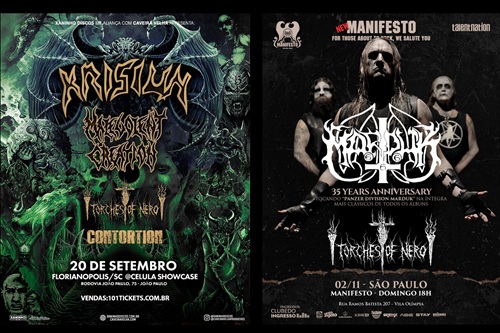 A banda de Black Metal Torches of Nero, formada em Rio Grande (RS) em 2021 e que conta com Baal Seth Penitent (vocal e guitarra), Blackpest (baixo) e Antimater (bateria), anunciou apresentações que irão marcar um novo ciclo em sua trajetória. A primeira apresentação será em Florianópolis (SC), no dia 20 de setembro, na casa de shows Célula Show Case. Na ocasião, a Torches of Nero abrirá para o Krisiun e os americanos do Malevolent Creation. Já em 02 de novembro, a banda segue para São Paulo para tocar no Manifesto Bar. Desta vez, ela se juntará à banda sueca Marduk, que celebrará 35 anos de carreira e tocará o clássico álbum “Panzer Division Marduk” (1999) na íntegra.